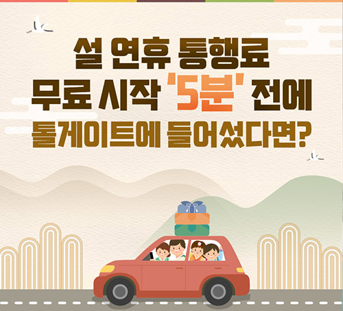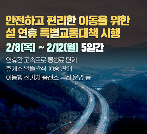 (통행료 면제) 국민 교통비 부담 완화를 위해 설 전·후 4일간(2.9~2.12) 전국 재정·민자 고속도로를 이용하는 모든 차량에 적용