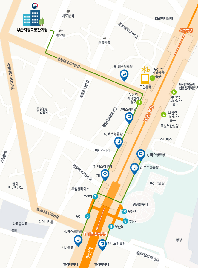 부산역 지하상가 3번출구 → 도보 5분 거리 - ○ 버스 이용(지도 상 숫자가 기입된 풍선 표시)